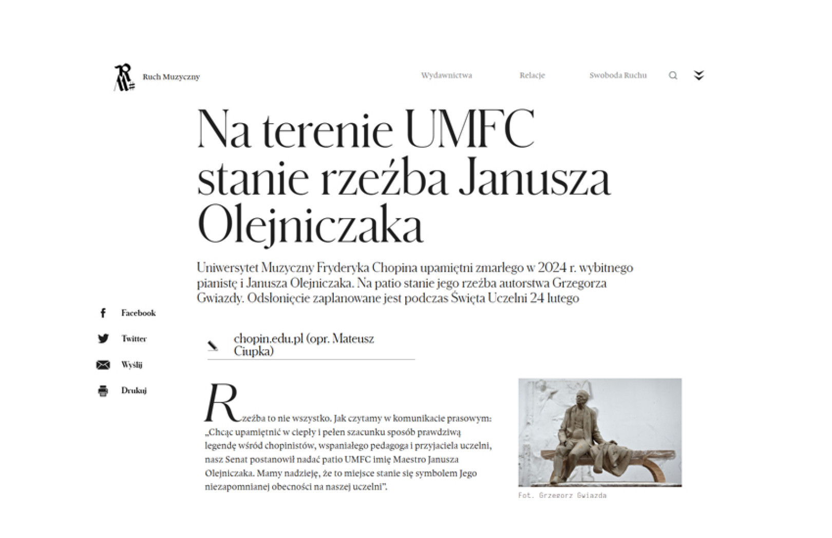 Rzeźba to nie wszystko. Jak czytamy w komunikacie prasowym: „Chcąc upamiętnić w ciepły i pełen szacunku sposób prawdziwą legendę wśród chopinistów, wspaniałego pedagoga i przyjaciela uczelni, nasz Senat postanowił nadać patio UMFC imię Maestro Janusza Olejniczaka. Mamy nadzieję, że to miejsce stanie się symbolem Jego niezapomnianej obecności na naszej uczelni”.[...]
